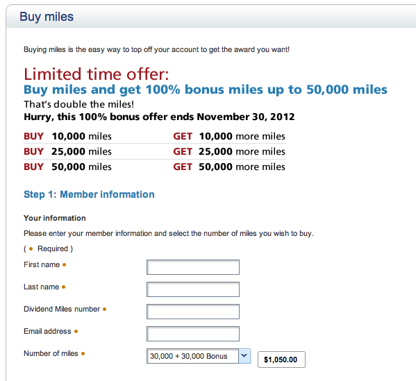Update (November 21, 2012): Off-peak availability for 60k mile roundtrips in Business Class is gone. If you didn’t get on the plane with me this year, I look forward to seeing you in 2013!