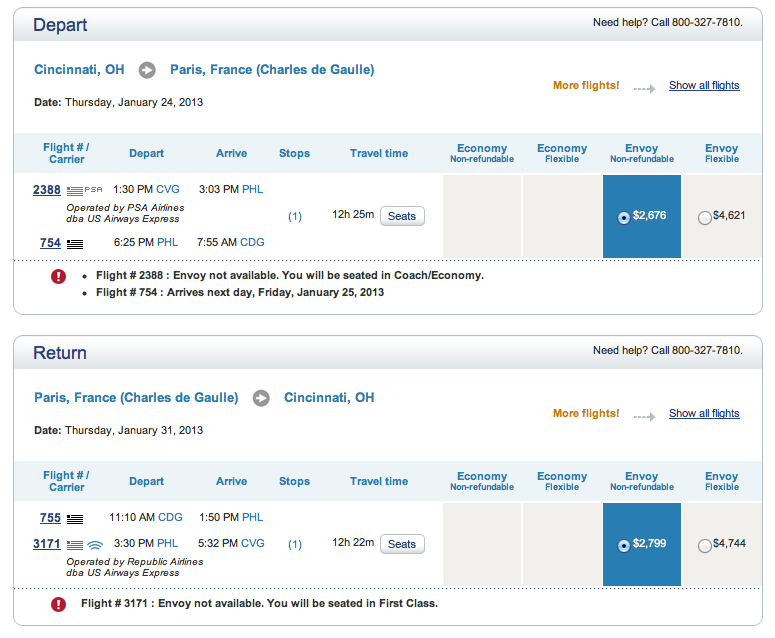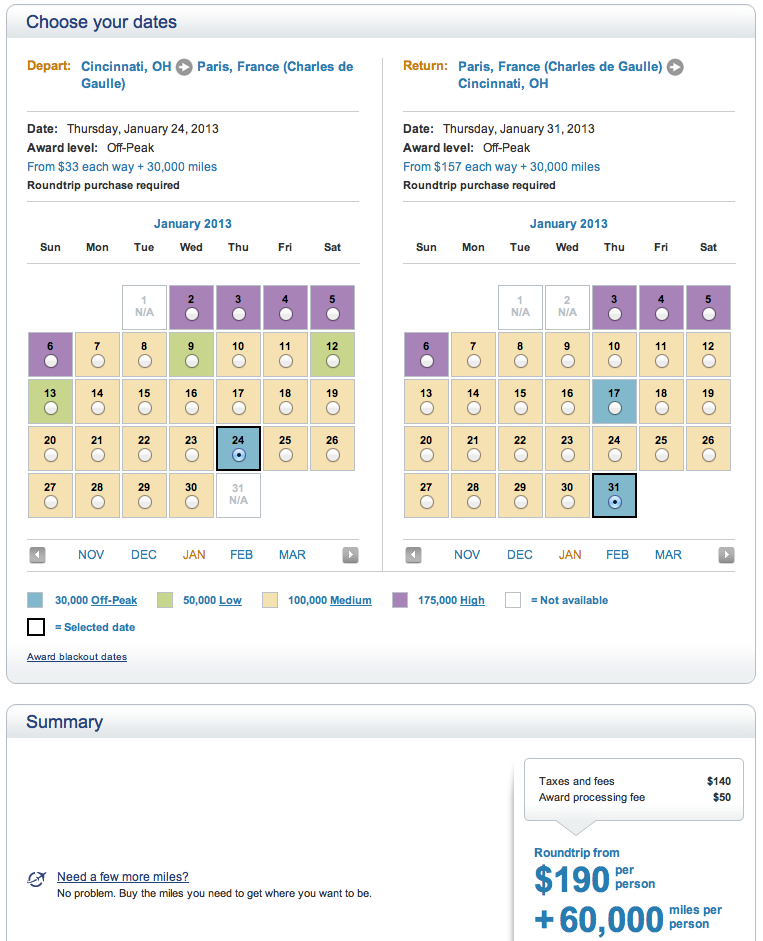“Off Peak” means US Airways chooses the dates for my vacation: Here’s the chart for January off-peak flights to Paris from Cincinnati. Notice anything funny? Yep. Only one day is “Off-Peak” outbound and only two days back. There are none in February. Oh, well, Paris museums are heated. A week in Paris in January sure beats an week in Cincinnati in January. Let’s go!