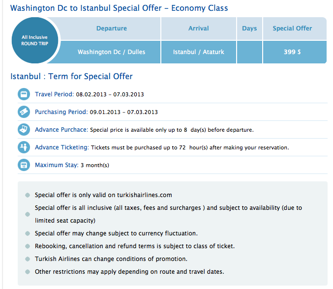 Turkish Airways has a $399 fare from Washington, D.C. (IAD) to Istanbul (IST) on its non-stop Flight 8, returning on its non-stop Flight 7.